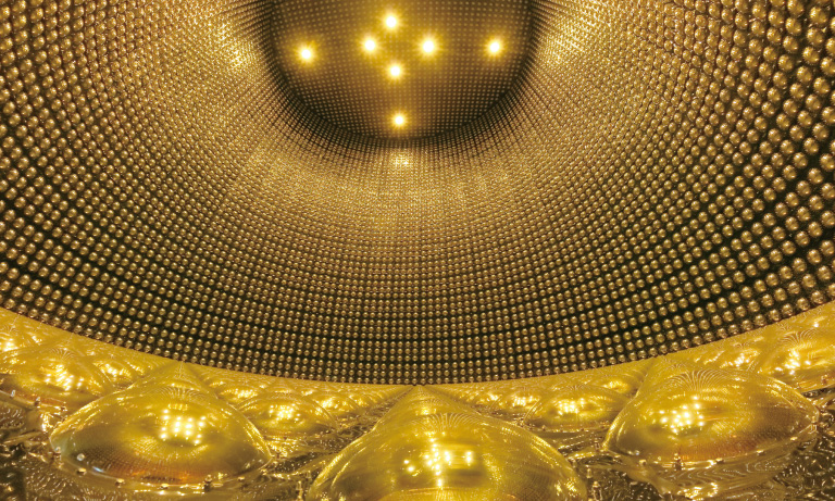 素粒子物理学の最先端実験施設です。超純水で満たされた巨大タンクの内壁に世界最大の光電子増倍管が取り付けられています。超新星爆発などによって宇宙から飛んでくるニュートリノと超純水が反応して発生する光を観測しています。