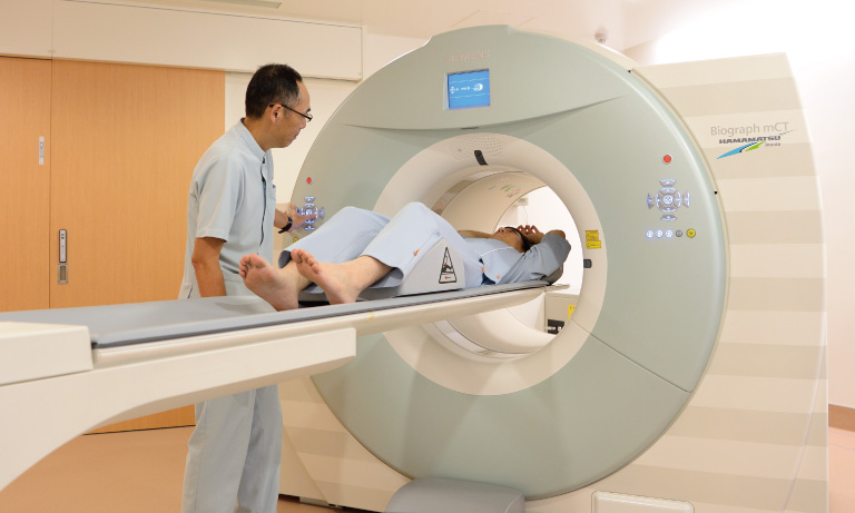 PETはPositron Emission Tomography (陽電子放出断層撮影)の略です。放射性薬剤を活用して、全身の機能を検査します。がんの早期発見だけでなく、脳機能検査に使用されています。
